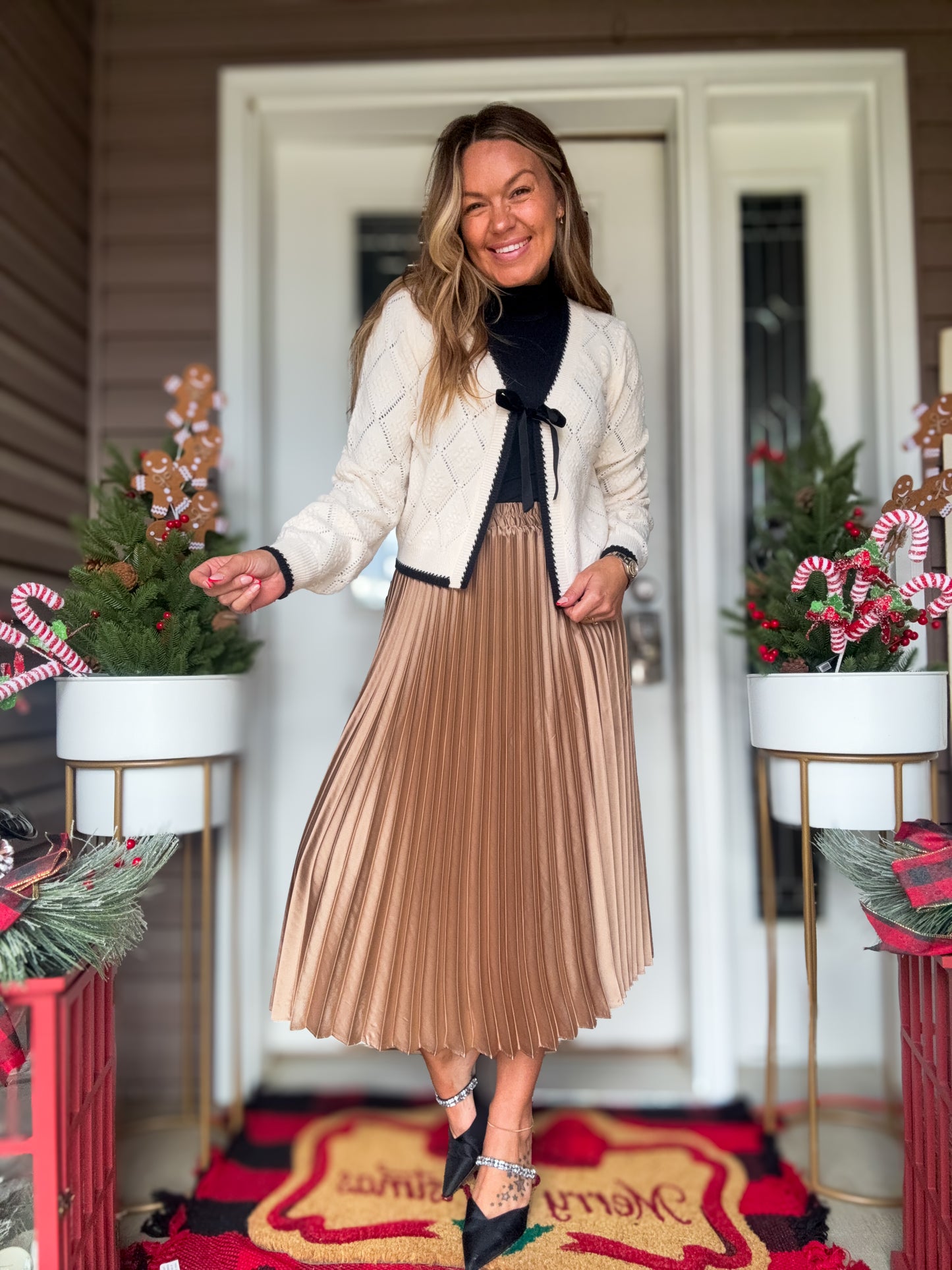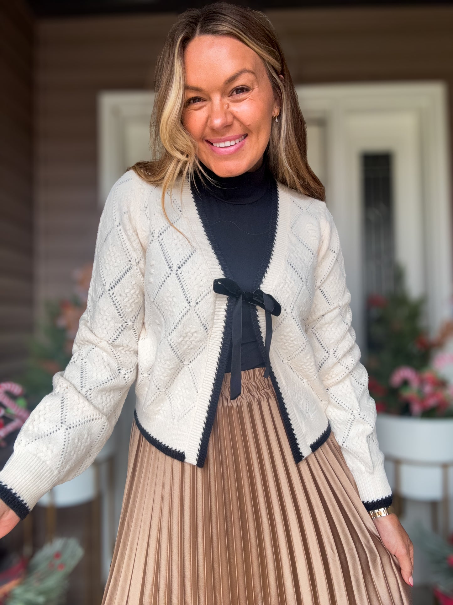 White Cardigan with Black Trim & Bow – Soft Open Front Sweater