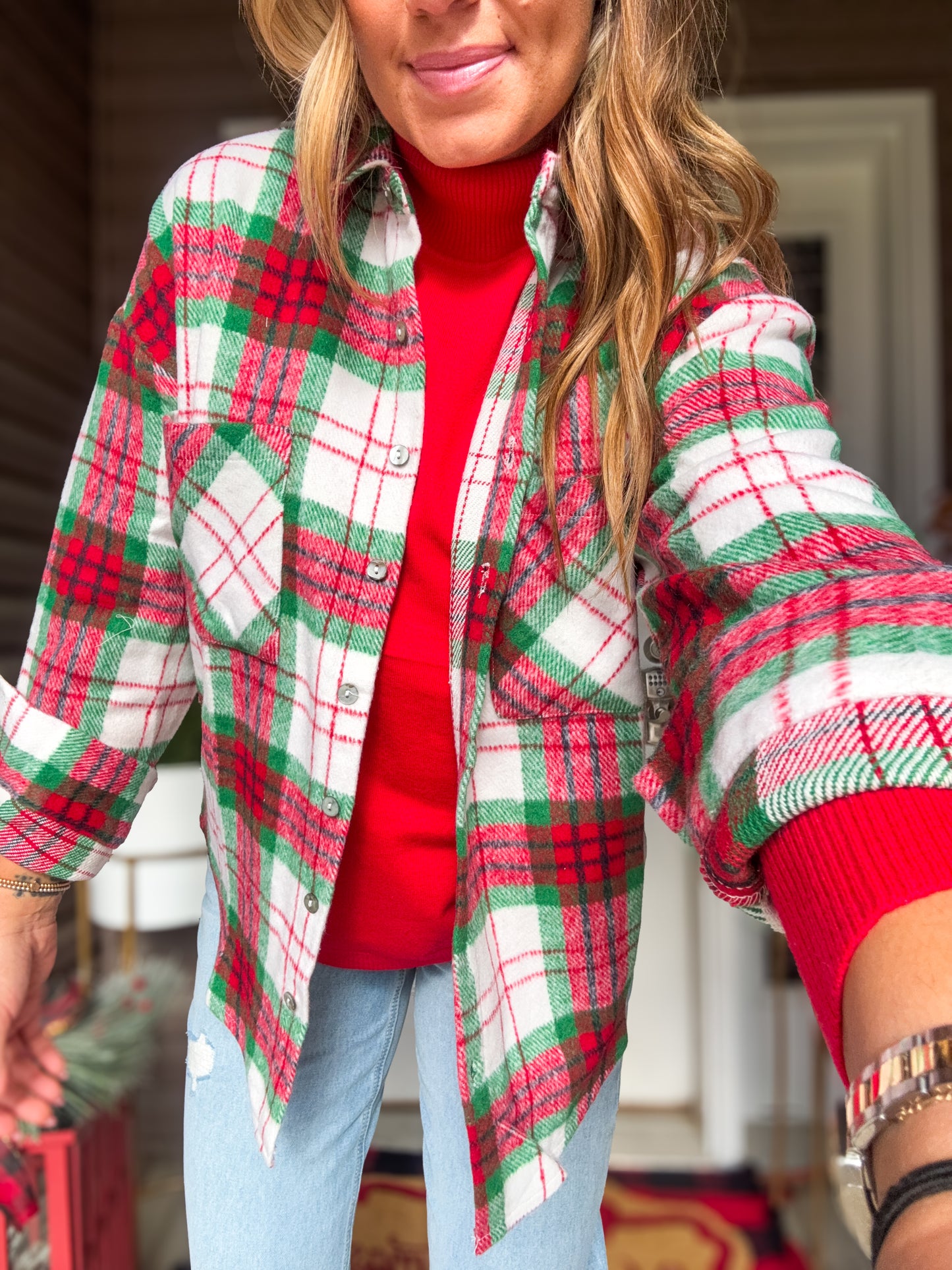 Designed with an oversized fit, it offers a relaxed silhouette that’s perfect for layering over sweaters, tees, or turtlenecks. The front pockets add both style and function, making it easy to carry small essentials. Whether for casual holiday events or everyday comfort, this plaid shacket combines warmth, functionality, and festive appeal.