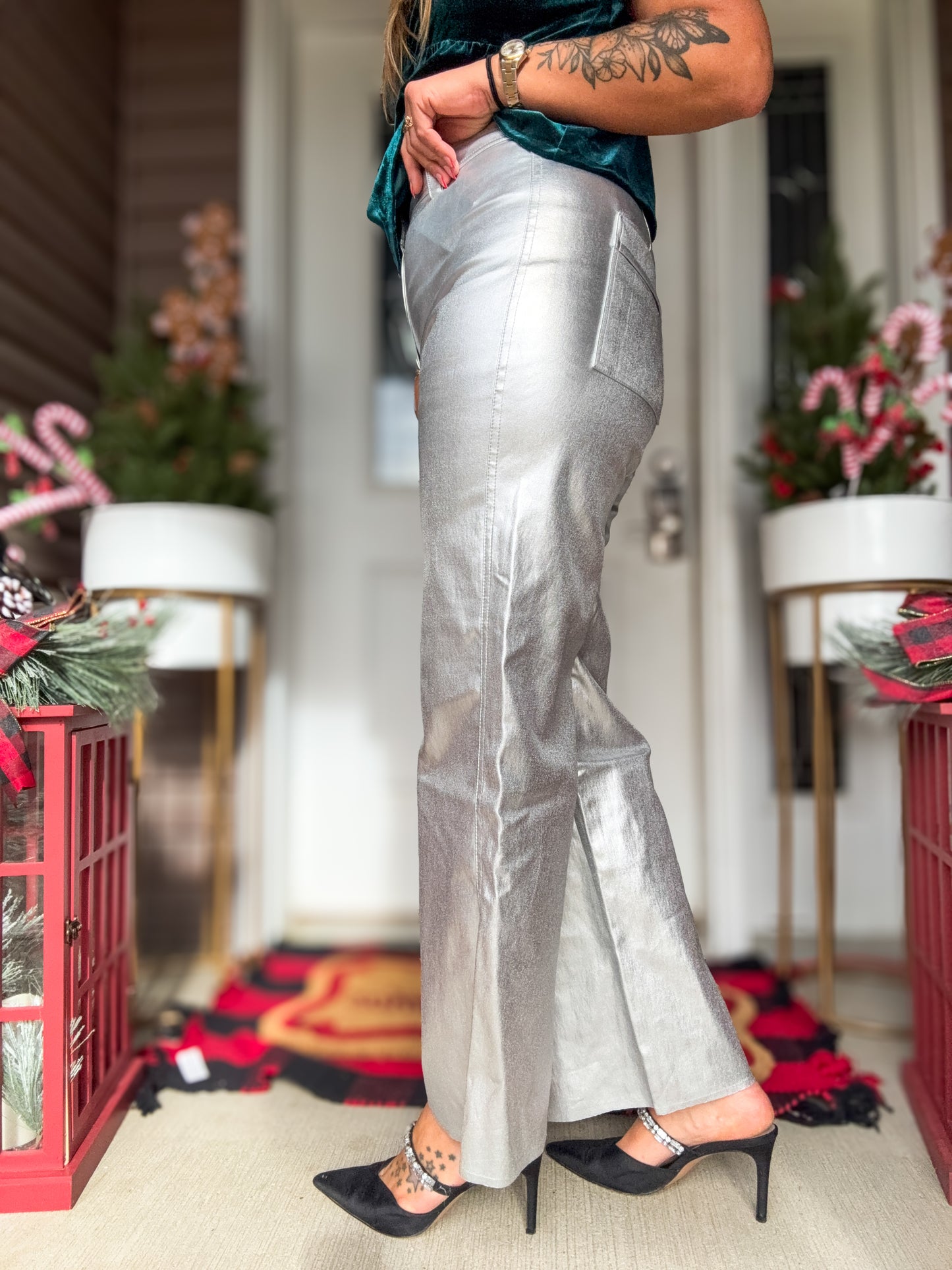 Shine bright and make a statement in our Silver Metallic Cropped Pants, the perfect show-stopping piece for your next holiday party, concert, or night out. Designed with a high-waisted fit and a comfortable cropped length, these pants deliver both style and stretch in all the right places.