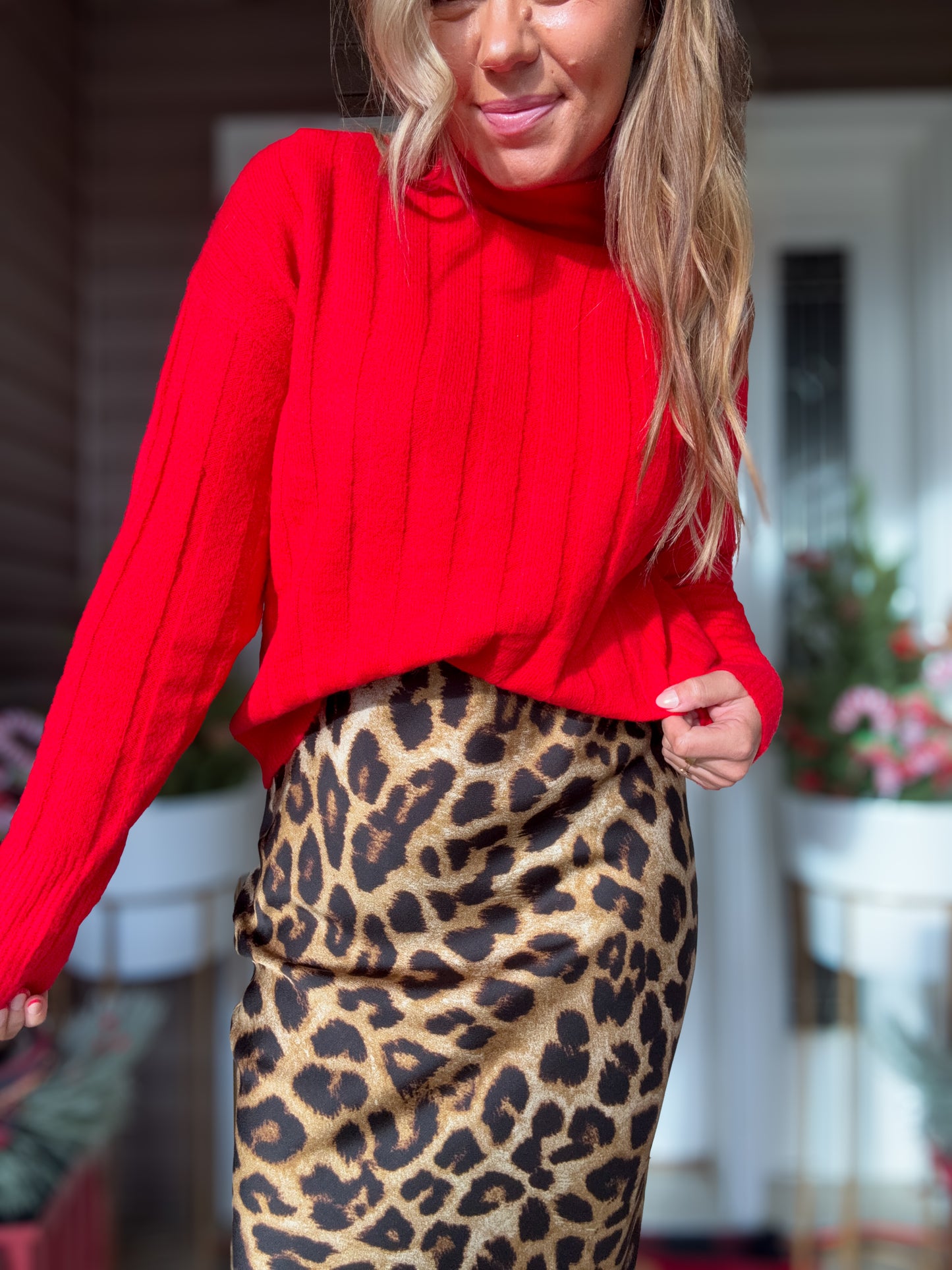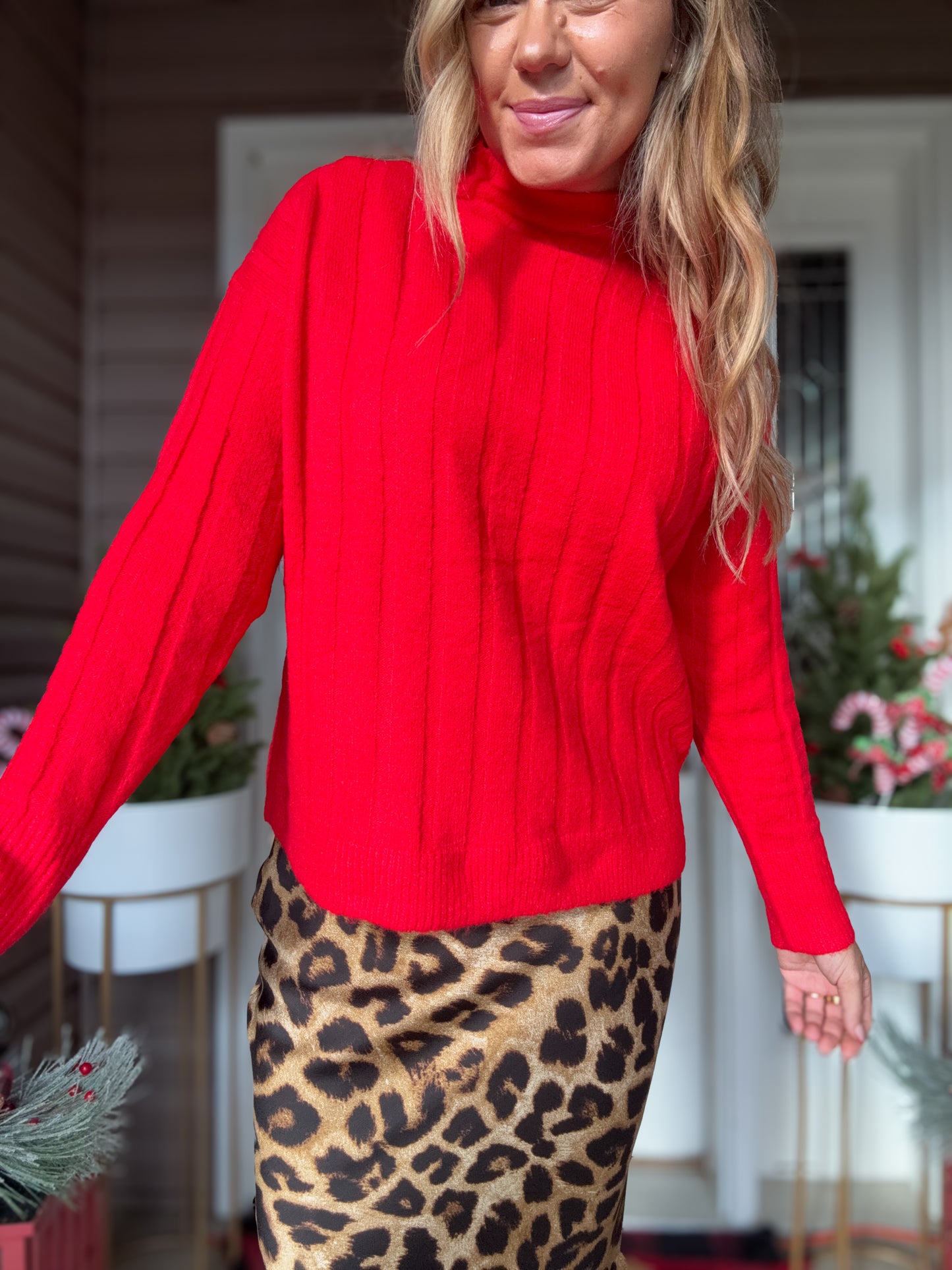 Featuring a mock neckline, long sleeves, and a wide ribbed knit texture, this pullover offers both warmth and timeless style. Available in two festive colors — red and green — it’s the perfect piece to elevate your fall and holiday wardrobe.