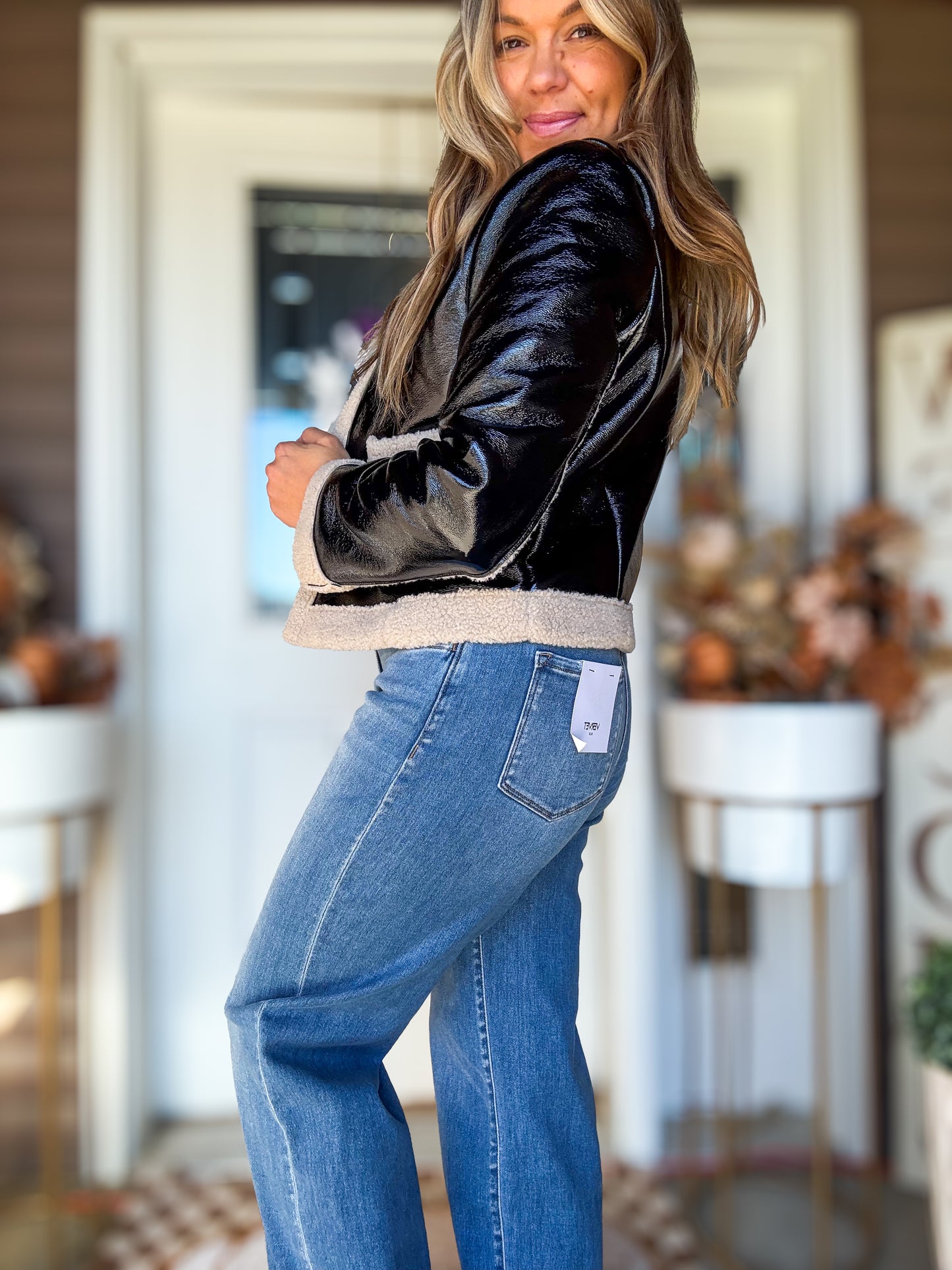 Stay warm and stylish with our FIENNE faux leathersherpa collarless open jacket. Its functional pockets make it a practical choice, while the luxurious materials and cozy shearling bonding elevate any outfit. Perfect for any occasion.
