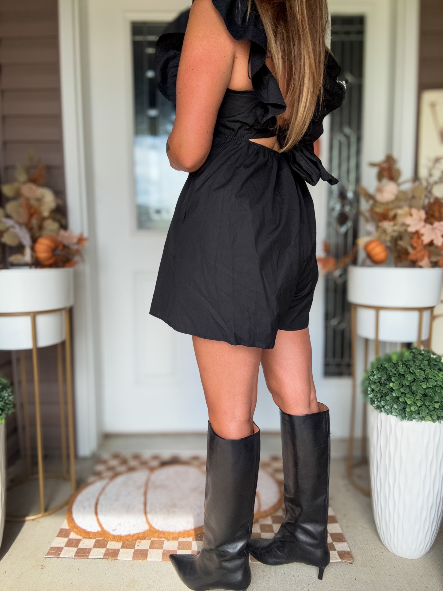 Introducing our black romper, featuring a chic ruffle shoulder detail and a charming bow tie back. Stand out with the vibrant red and silver star detail, adding a touch of glamour to your look. Elevate your style effortlessly with this versatile and trendy piece.