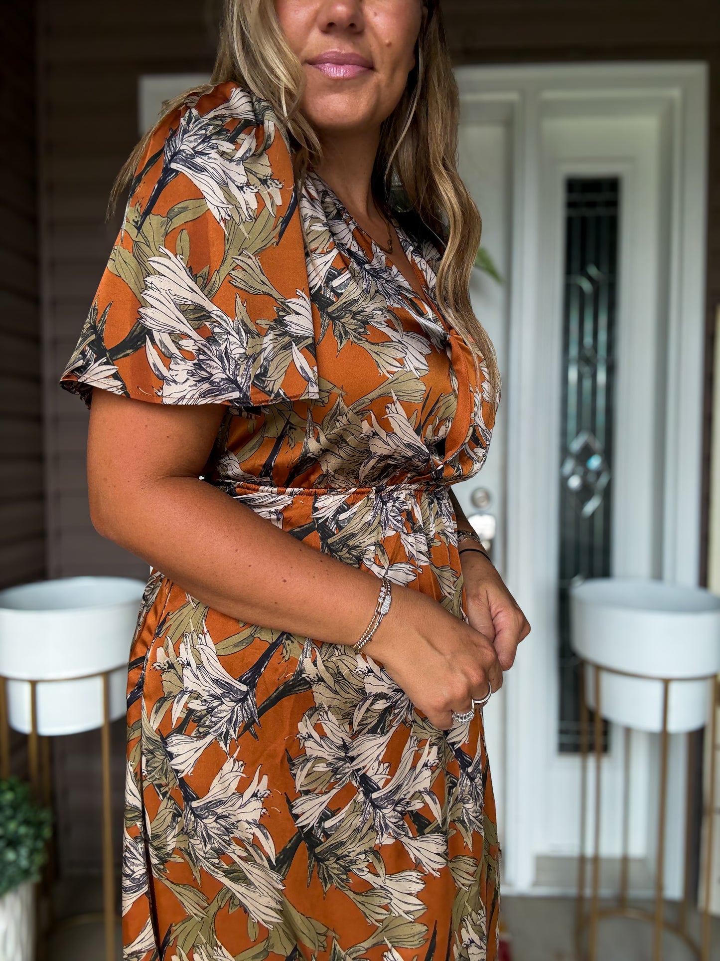Bring effortless elegance to your wardrobe with our Leaf Print Surplice Maxi Dress, a chic and versatile piece designed for both comfort and style. Featuring a flattering V-neckline with a secure snap button, this dress combines feminine detail with functionality. The flowy bell sleeves add drama and movement, while the surplice design and side slits keep the silhouette fresh and modern.