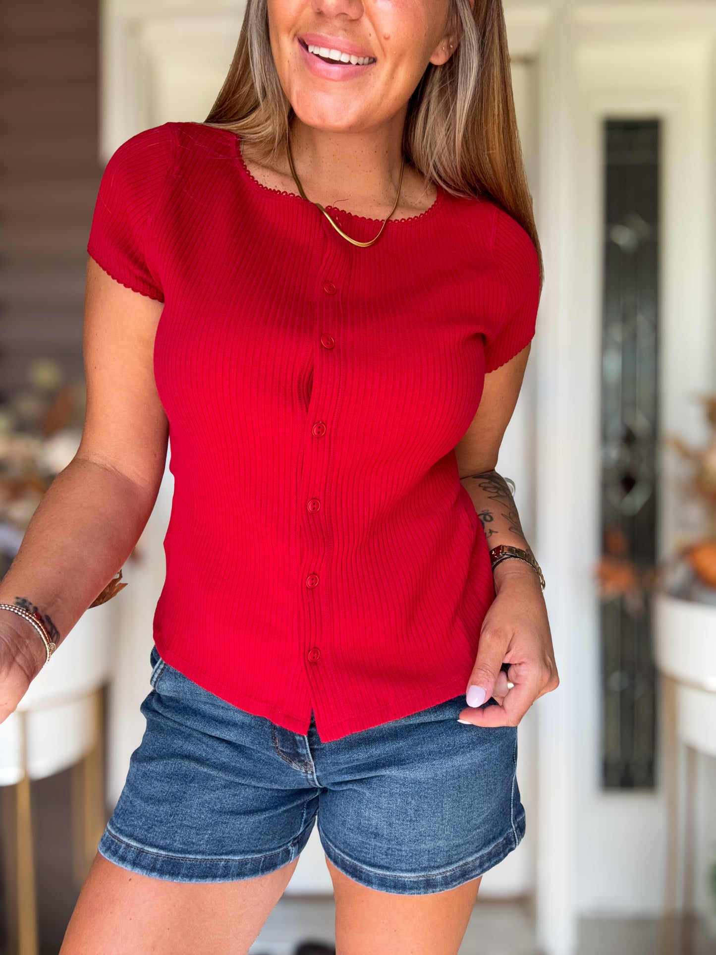 Cute and classic, this shrunken cardi is featured in a hugging ribbed fabrication with short capped sleeves and buttons all the way up the front.