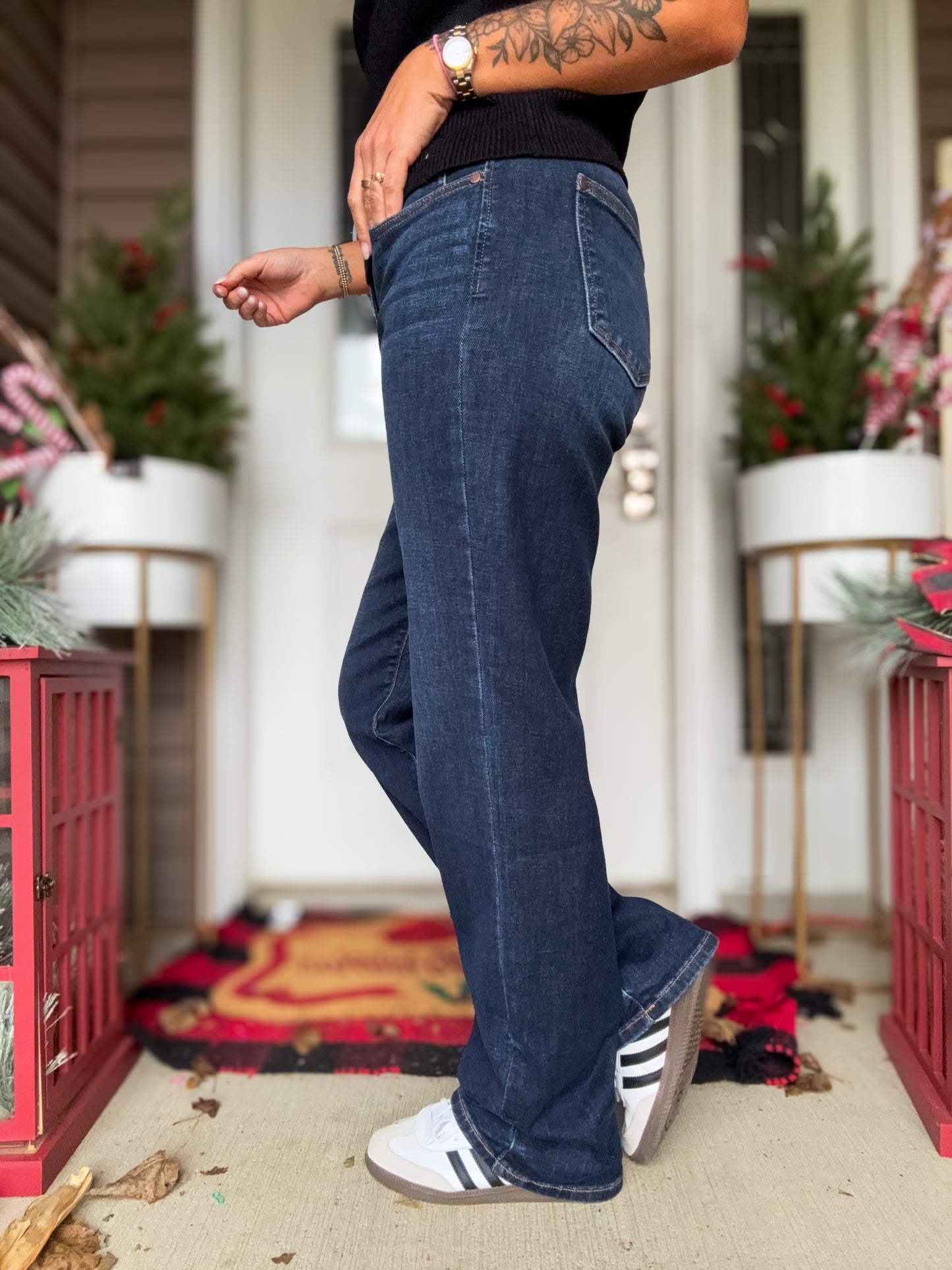 Shop now and enjoy the classic style and comfortable fit of Judy Blue’s MR Straight Dark Wash Jeans — your new favorite for every day!