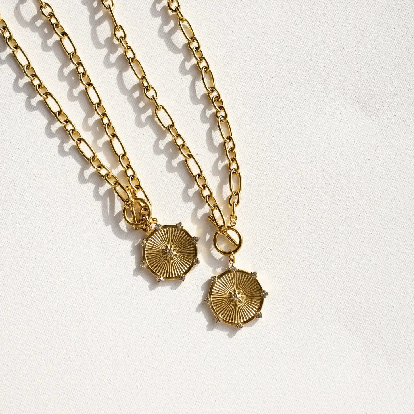 Add some playful flair to your style with the Raylee Toggle Coin Necklace. Featuring a trendy toggle coin design, this necklace is perfect for effortlessly enhancing any outfit. Take accessorizing to the next level with this fun, everyday piece! * 20" + 1" Coin * CZ detail on coin * Waterproof * Tarnish resistant * 18K Gold plated stainless steel * Hypoallergenic