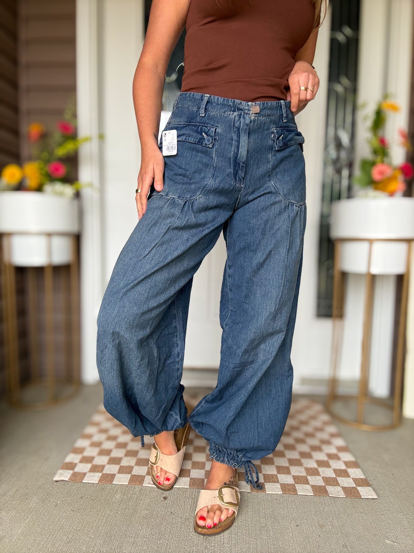 So cool balloon-style jeans from our We The Free collection, featured in a low-slung, mid-rise silhouette with patch-style front pockets and adjustable drawcord cuffs, finished with femme pleating throughout for added dimension.