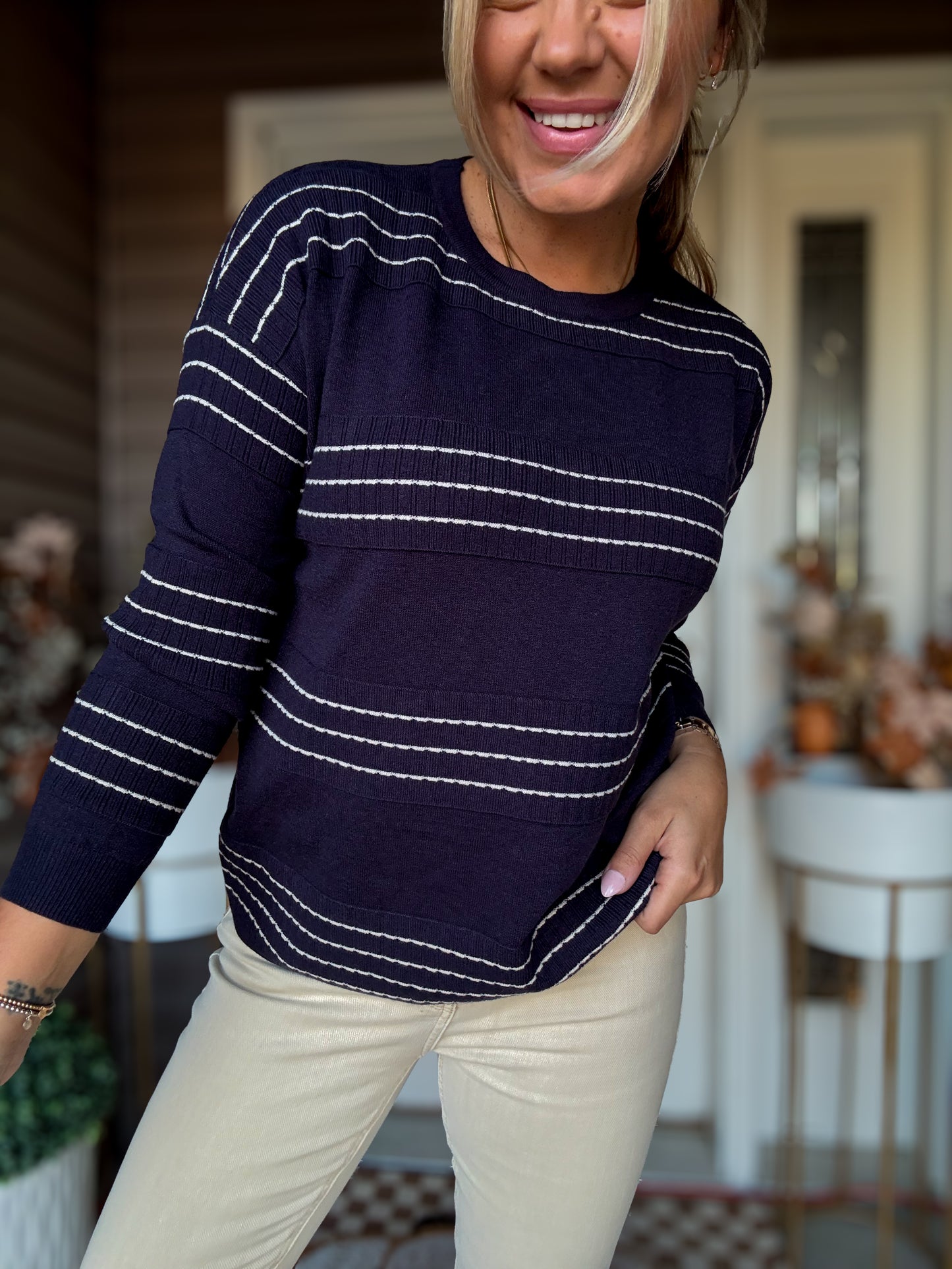 Cozy meets classic in our Stitch Striped Crew Neck Sweater, the perfect everyday pullover with just the right touch of texture. Featuring subtle stitched stripe detailing, this sweater adds dimension while keeping your look effortlessly clean and timeless.