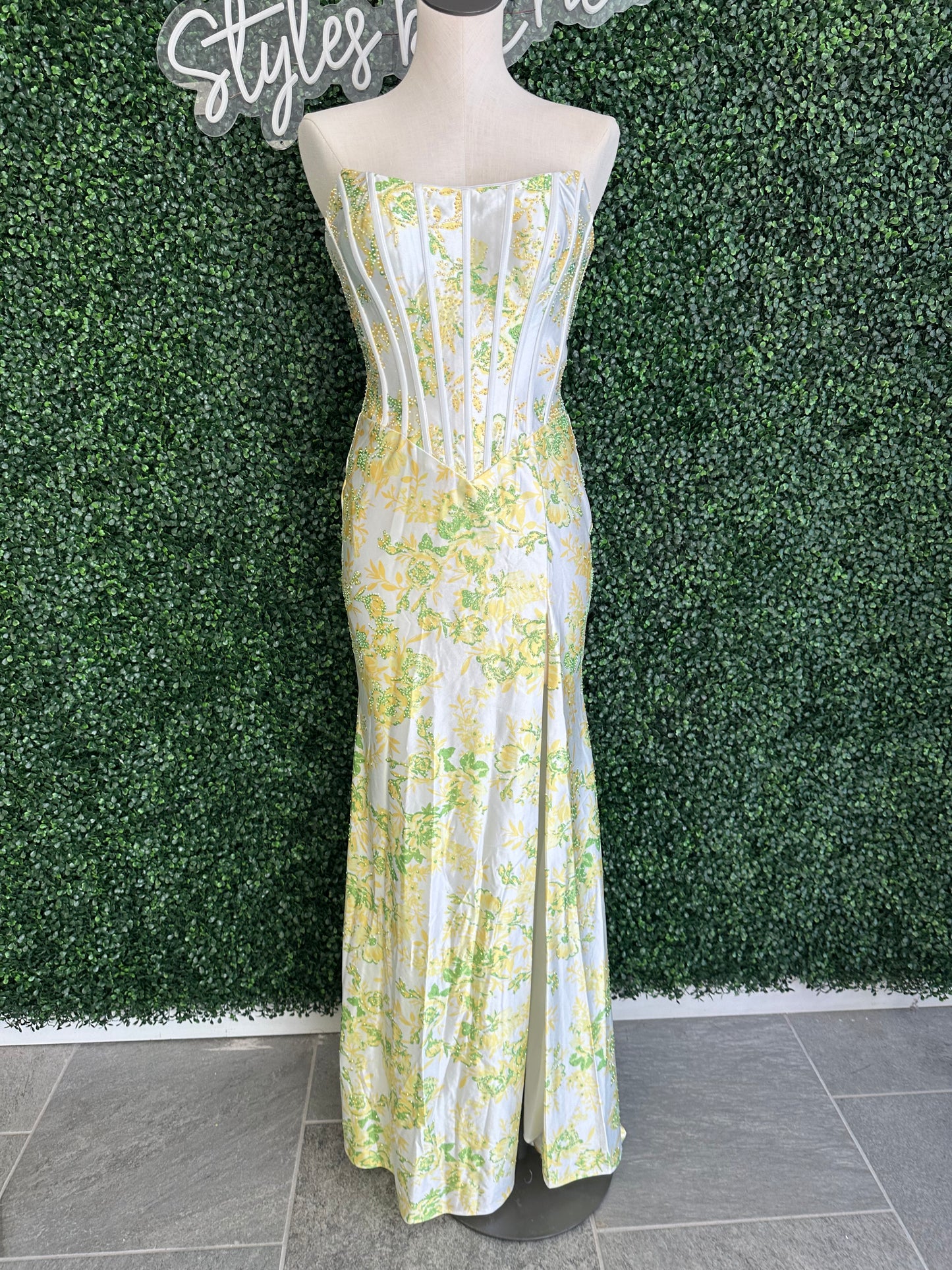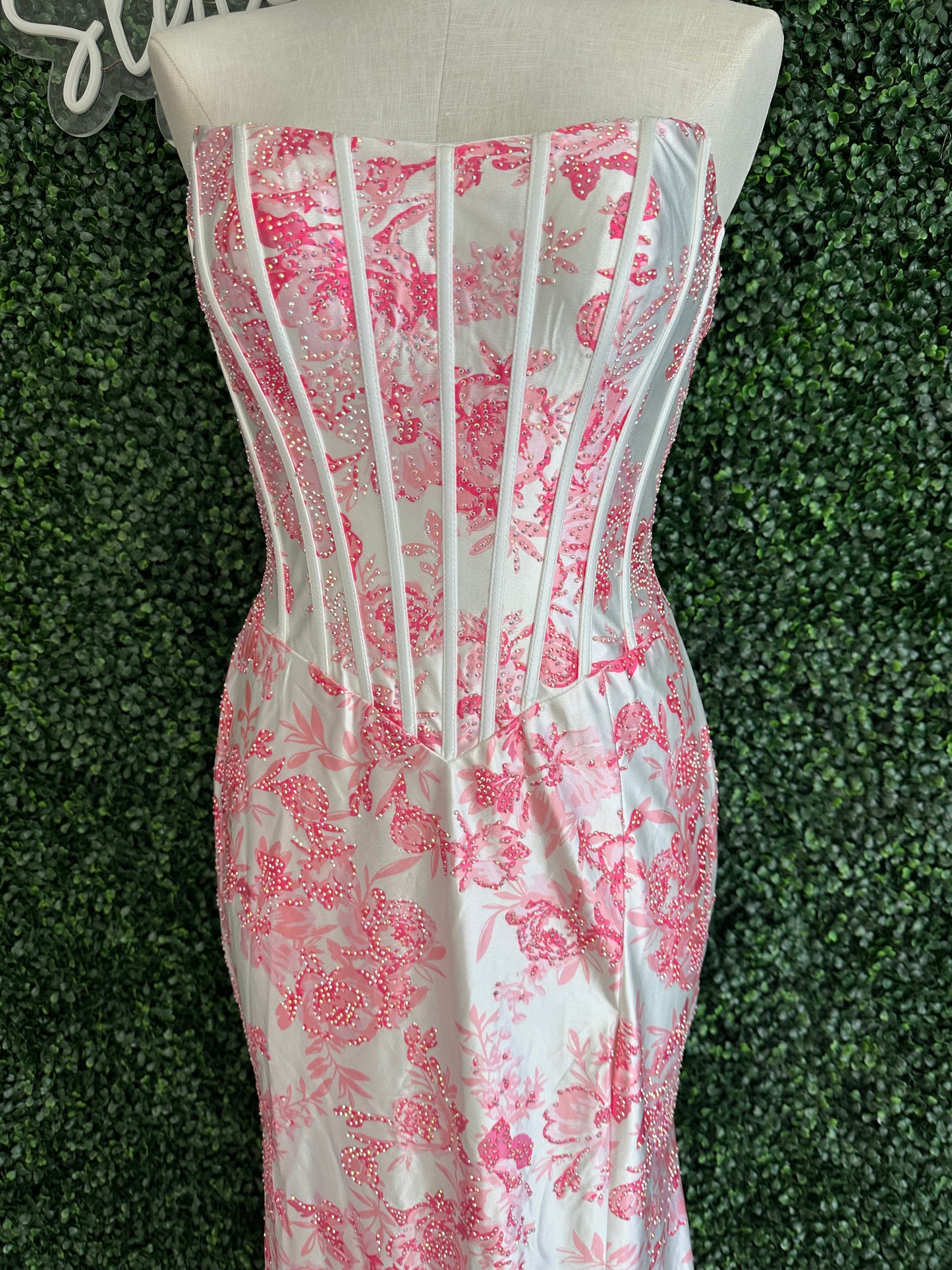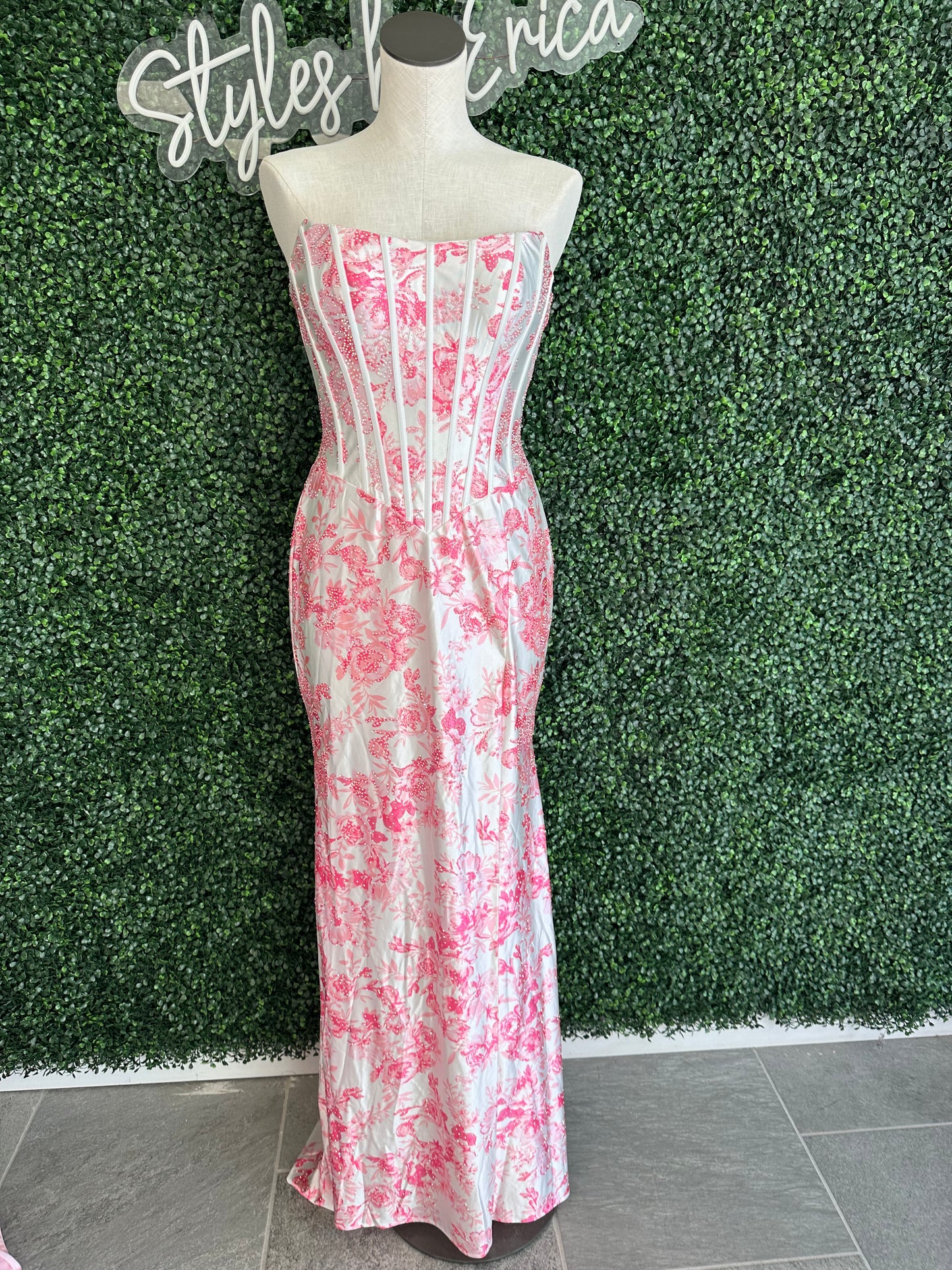 Fitted strapless floral gown with corset bodice and a skirt slit.