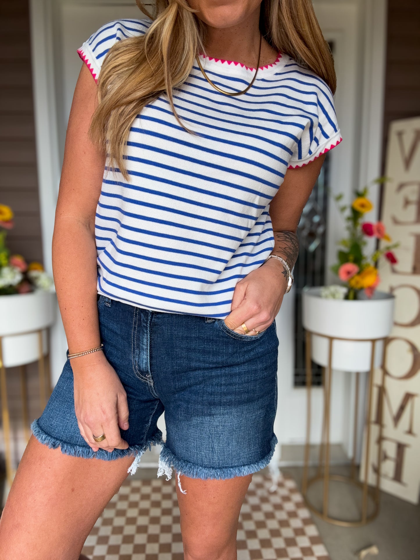 Meet the Staccato Striped Accent Crew Neck — a polished, go-anywhere top designed for women who value quality and effortless style. Crafted from a soft 50% cotton / 50% viscose blend, this short-sleeve shirt feels breathable and luxe against the skin. The classic striped body is elevated with a finished color-accent crew neckline for a refined, modern look that transitions seamlessly from the office to dinner with the girls. Tailored with a generous fit through the midsection, it flatters and moves with you—ideal for moms on the go and anyone who needs a dependable, stylish go-to. Available in three versatile color options, this Staccato top layers easily under blazers or pairs perfectly with jeans for weekend plans. Quality construction and timeless design make it a wardrobe staple you’ll reach for again and again.