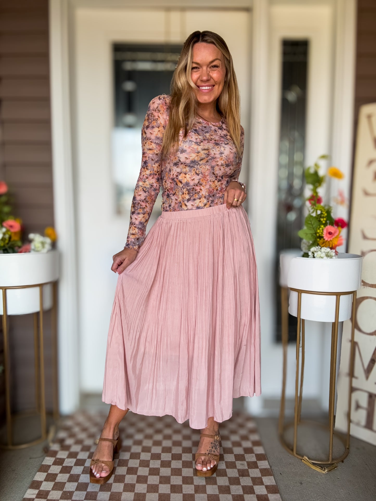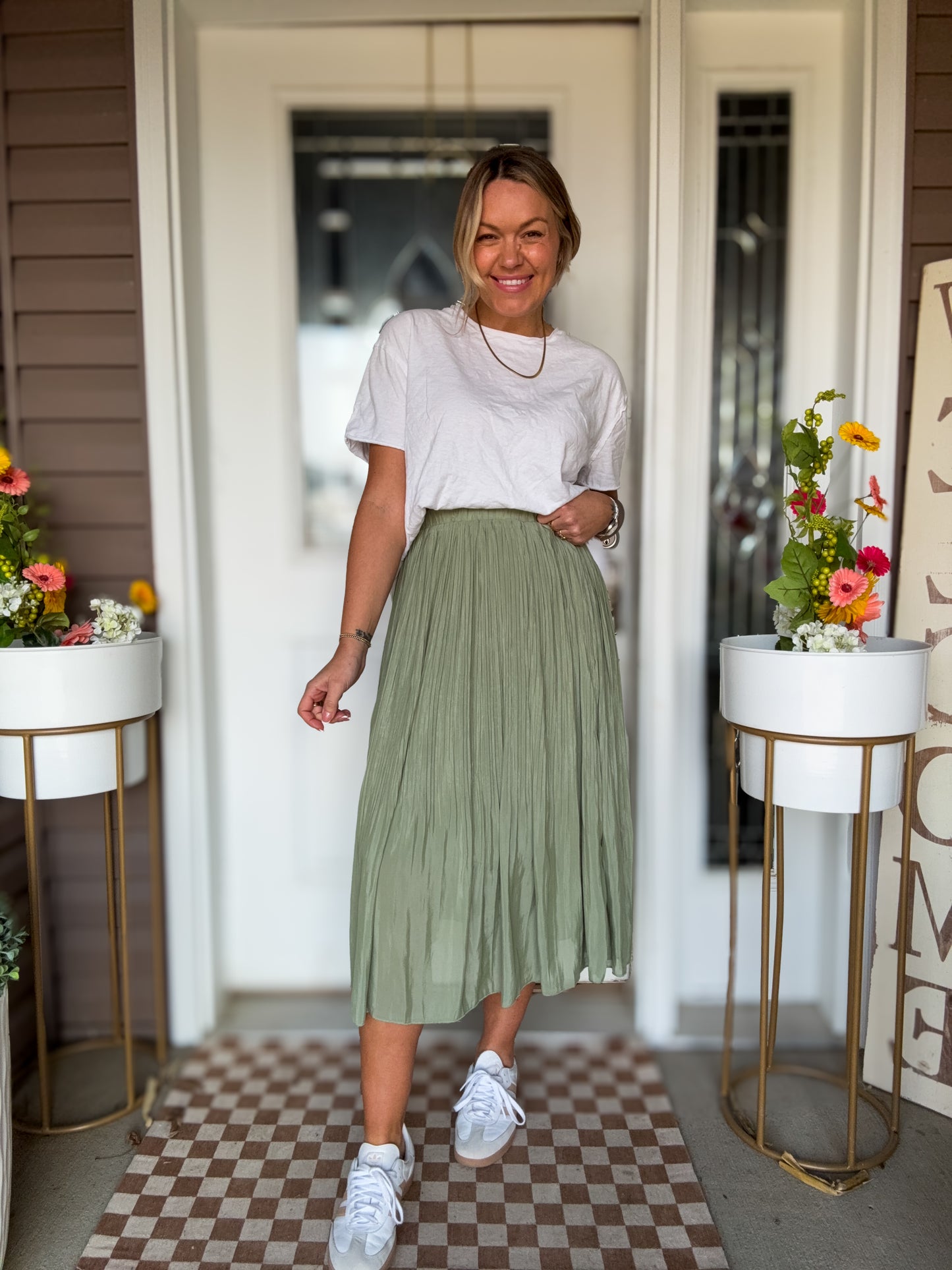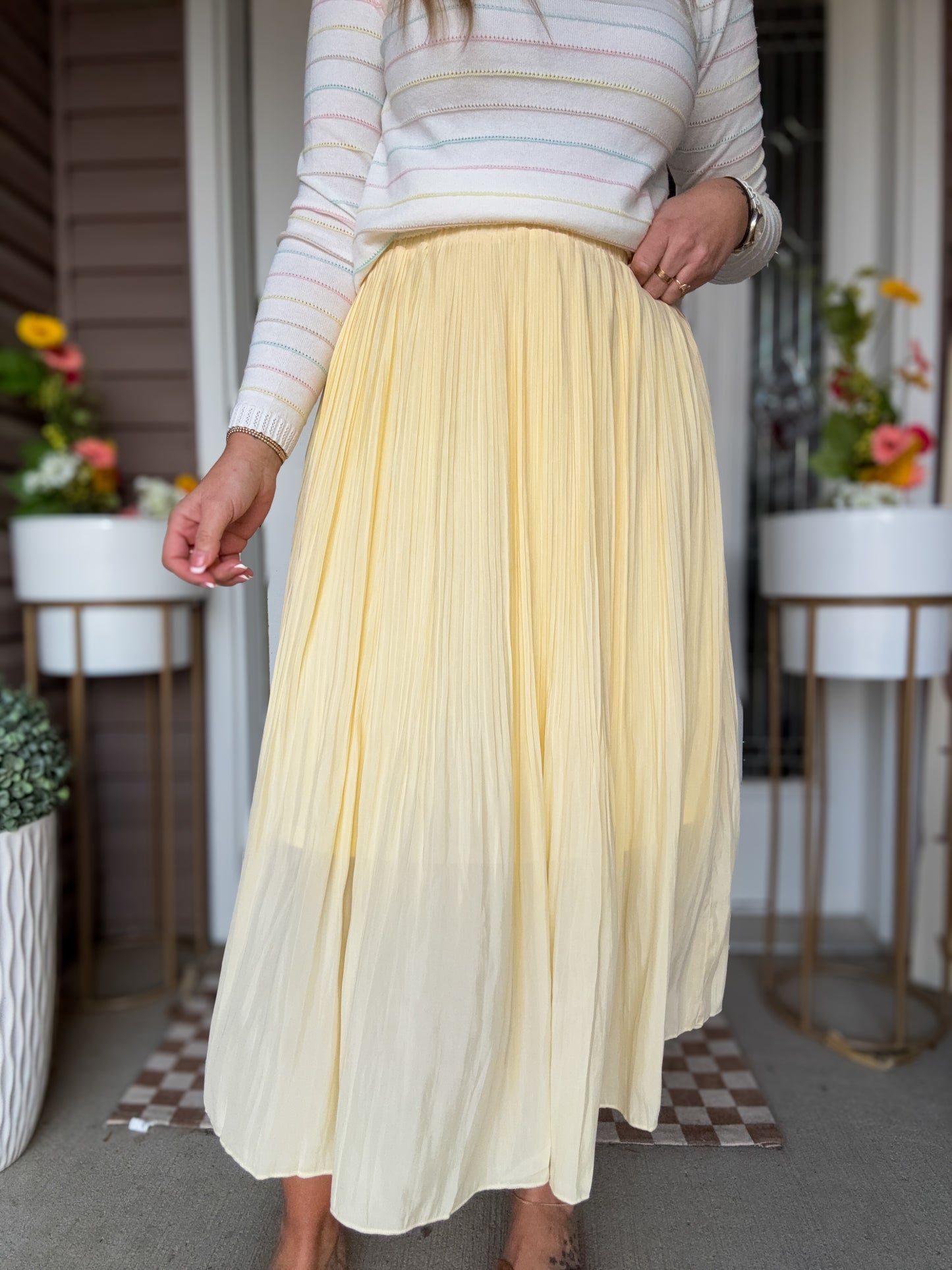 Flirty Girl Midi Skirt — a breezy, feminine staple in dust mauve, sage green, and butter yellow. Designed with a comfortable elastic waistband and midi length, this skirt features a flattering gathered (speated) detail and a built-in liner for smooth coverage and easy movement. Made from lightweight 100% polyester, it drapes beautifully for daytime charm or dressed-up evenings. Available in Small, Medium, and Large, the versatile silhouette pairs perfectly with tees, cropped sweaters, or a fitted blouse. Care: gentle cold wash, do not bleach, hang to dry, cool iron. Ideal for spring and summer events, weekend brunches, or casual office looks, the Flirty Girl Midi Skirt blends effortless comfort with playful, polished style.