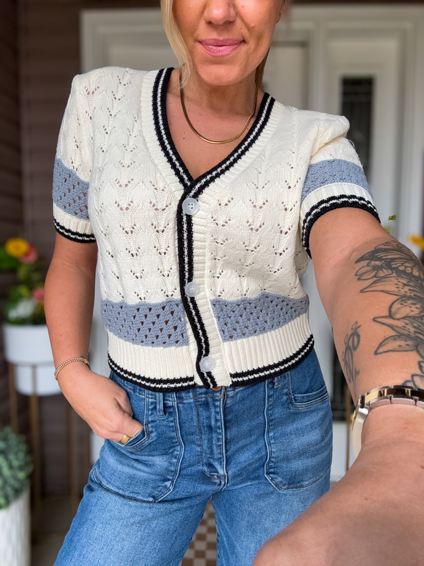 Steve Madden Fiona Cardigan | Crochet Striped Cardigan with Functional Buttons in Blue and Black, Soft & Stylish