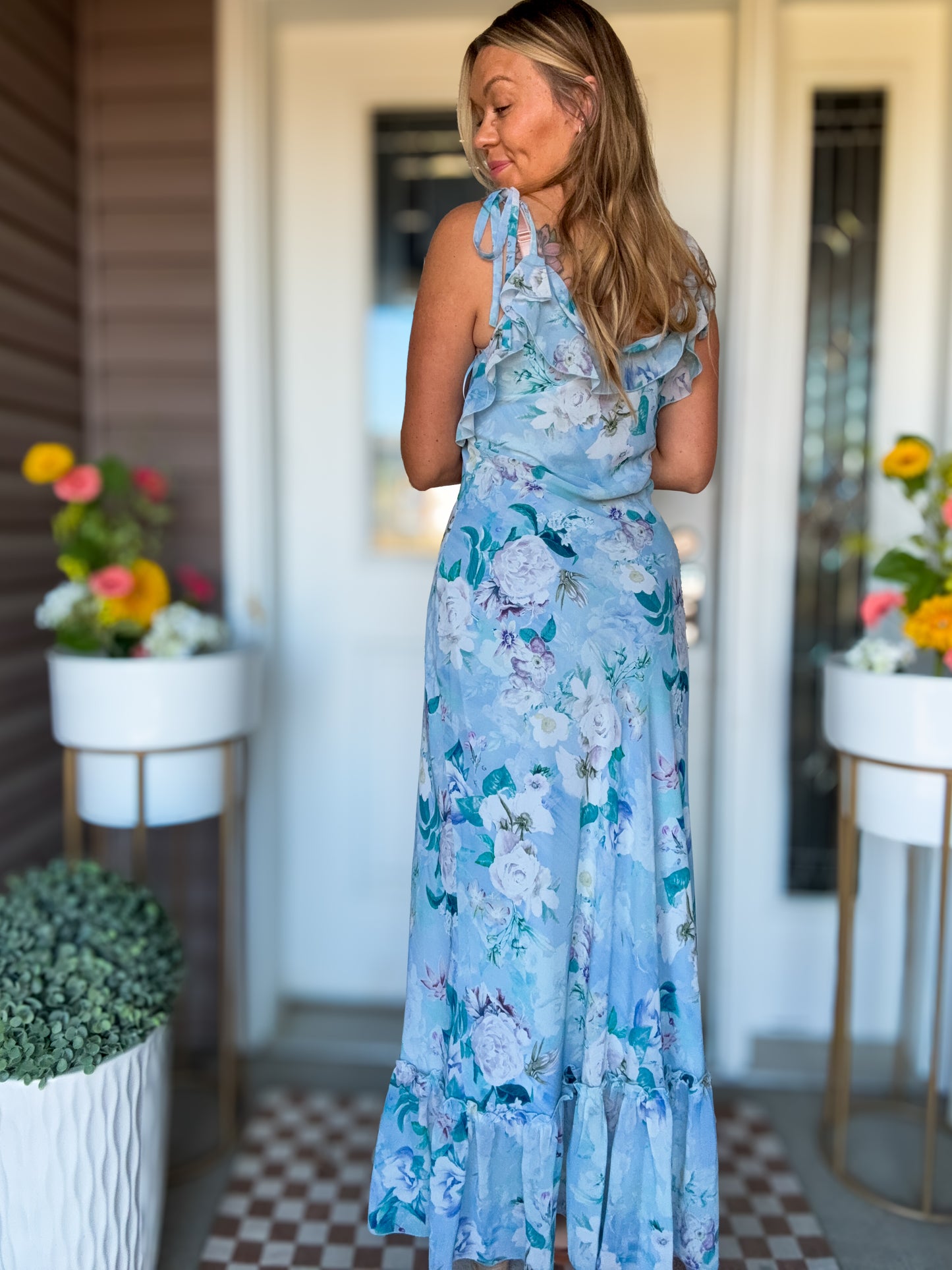 Steve Madden Maleena Dress | Ruffle-Trimmed Chiffon Maxi Dress with Adjustable Tie Straps