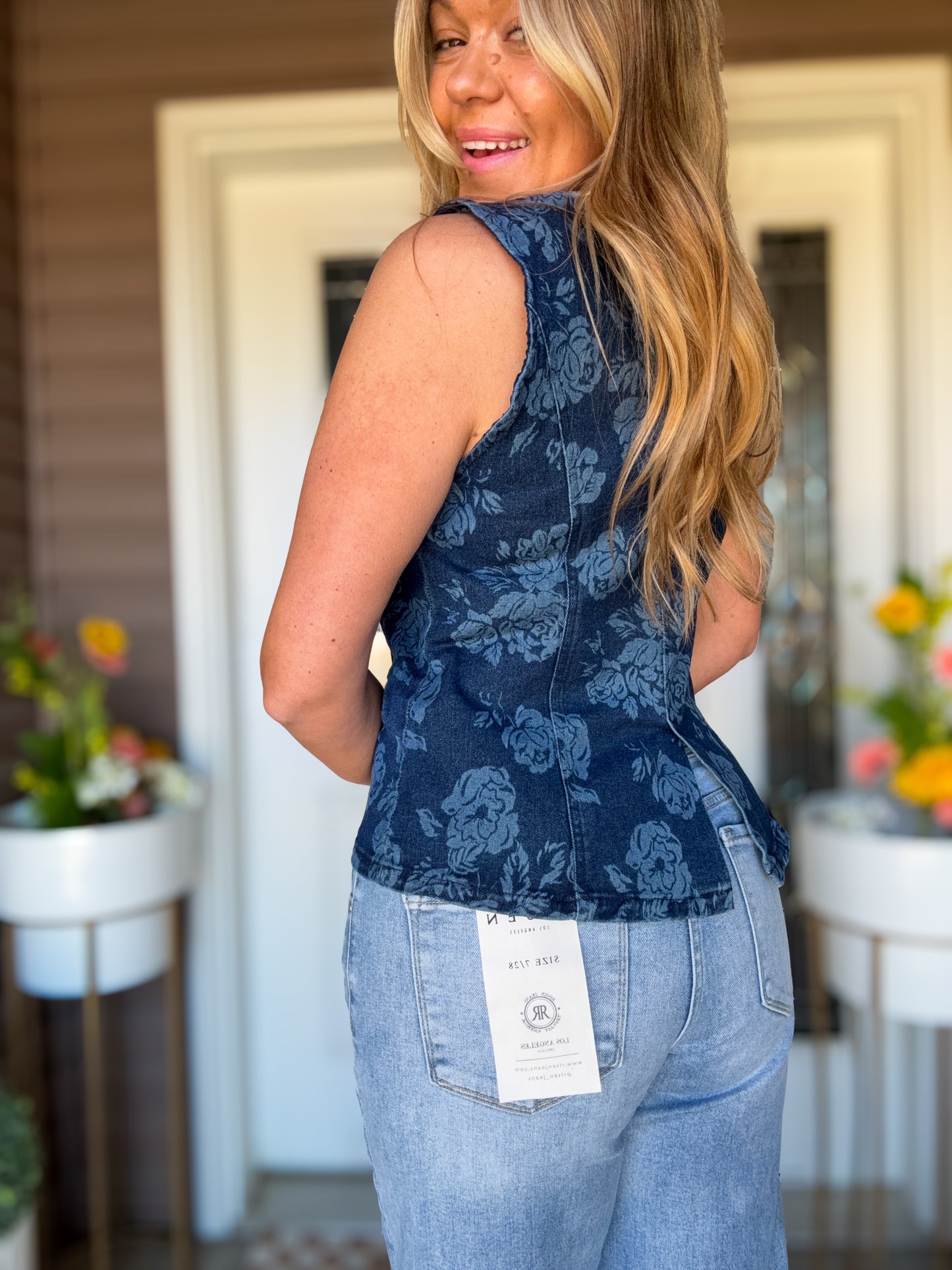 Classic denim meets feminine detail in the Steve Madden Wesley Top – Rose Frost, a versatile piece designed to elevate your everyday wardrobe. This sleeveless denim vest top features a structured, flattering silhouette with a button-up front and a soft rose floral print that adds just the right amount of visual interest.