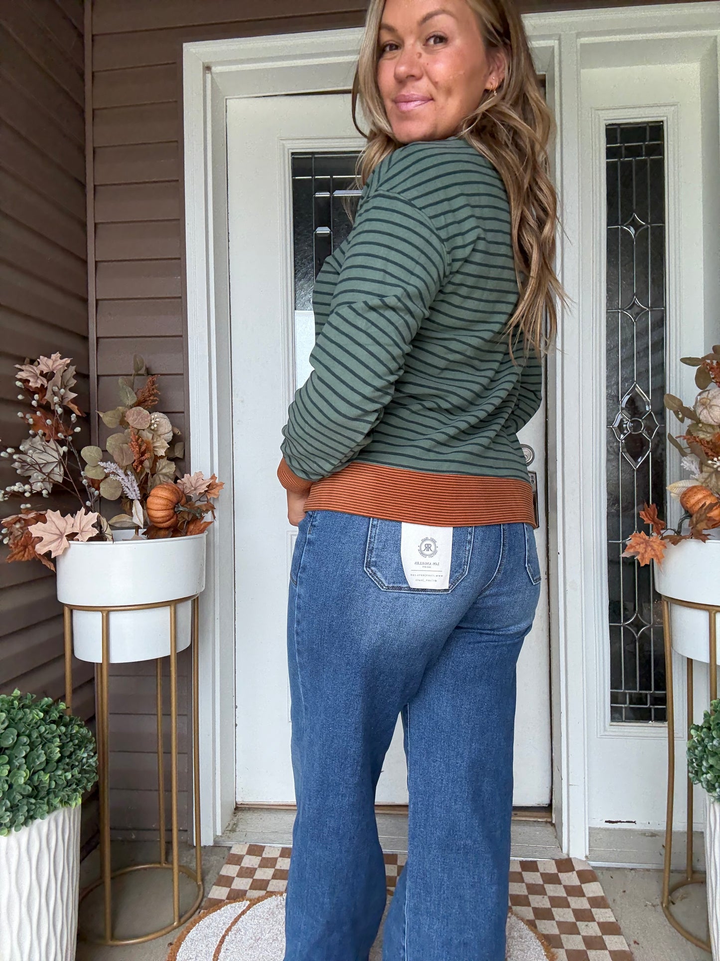 Pumpkin Patch Sweater by Staccato | Striped Mix Sweatshirt with Pocket in Town Green & Orange Accents, Cozy Suede Feel, Sizes Small-XL