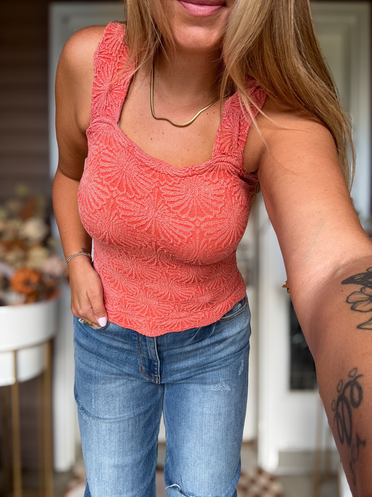 So sweet cami featured in a cropped, square-neck silhouette and jacquard floral design with statement lettuce-edge hemline.