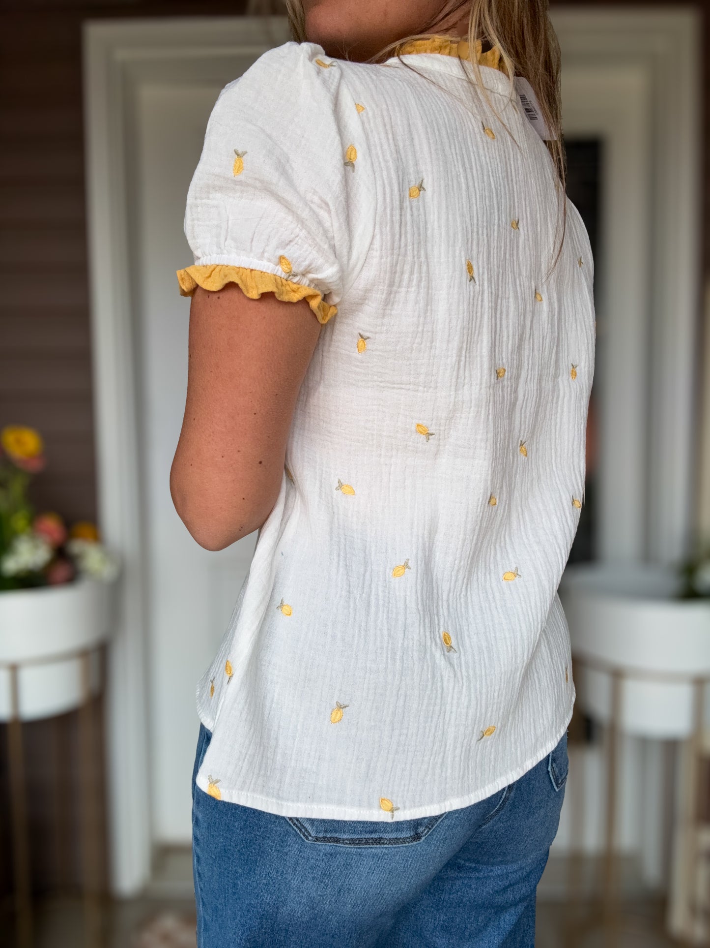 The Staccato Lemon Drop Top is a light, breezy piece that brightens seasonal wardrobes with soft texture and playful detail. Crafted from 100% cotton gauze, this airy top features a feminine tie‑neck and subtle yellow contrast at the sleeves and neckline for a fresh, modern pop of color. The relaxed silhouette and breathable fabric make it effortless to wear on warm days—perfect alone with denim or layered under a blazer for the office. Offered in sizes S–XL, the Lemon Drop Top is ideal for women who value comfortable, quality pieces that transition from daytime errands to casual lunches and evenings out. Lightweight, easy to style, and thoughtfully designed, it’s a cheerful staple for busy moms and professionals seeking an easygoing yet polished look.