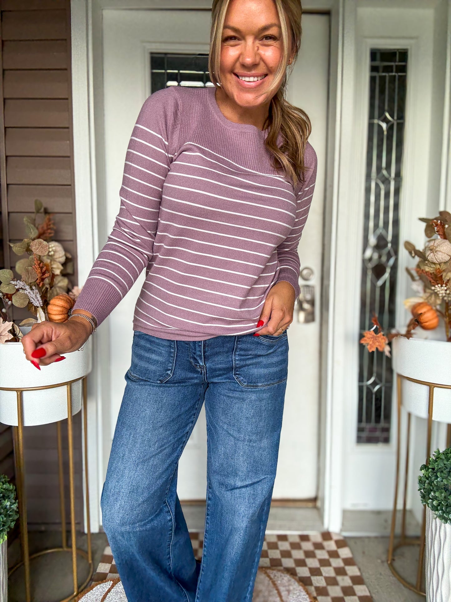 Simple Stripe Crewneck by Staccato | Lightweight, Soft, Long Sleeve Pullover in Dark Lavender & Taupe