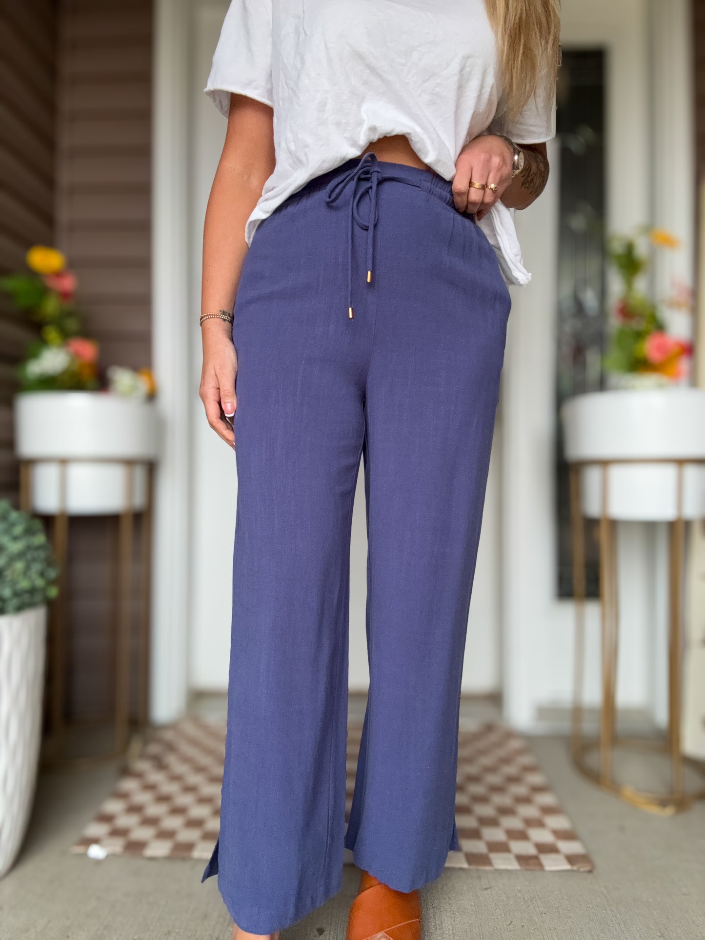 Staccato Linen Pant — relaxed linen-blend pants in light navy and taupe with effortless, everyday polish.